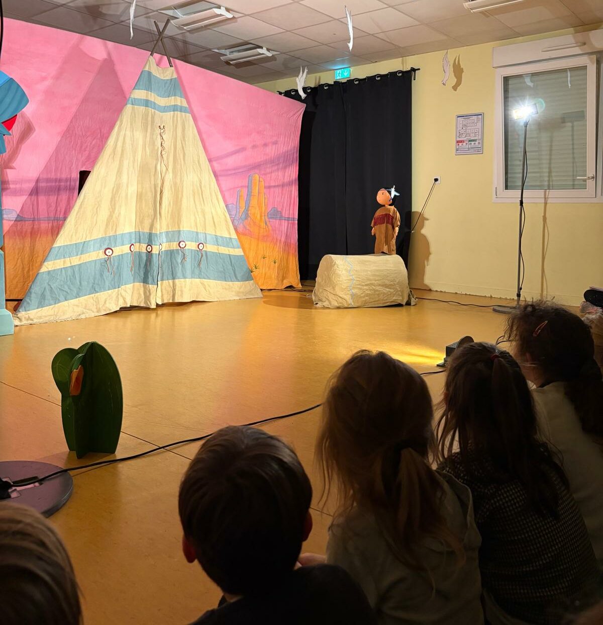 Mardi 27 janvier, tous les élèves de la petite section jusqu’au CP ont vécu un moment très joyeux et spécial : nous avons assisté au spectacle « Petite Indienne », présenté par la compagnie de théâtre Les 3 Chardons.